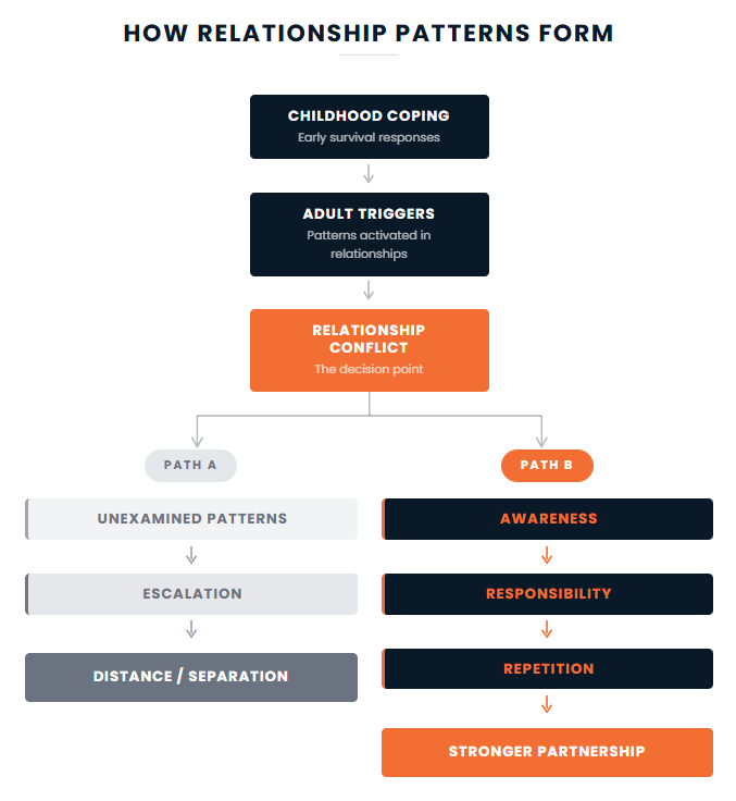 Couples Relational Work helps partners understand where their patterns come from, and how to replace automatic reactions with conscious adult responses.